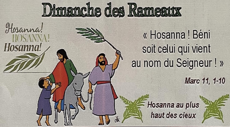 Avec tous les chrétiens du monde entier, nous entrons aujourd’hui dans la Semaine Sainte. En ce dimanche, nous faisons mémoire de l’entrée de Jésus à Jérusalem. Jésus s’arrête sur le Mont des Oliviers et il envoie deux de ses disciples lui chercher une monture. Il n’arrive pas sur un char, comme le ferait le chef d’une armée libératrice, mais surun petit âne. Et lors de son entrée, il est acclamé par la foule. Les rameaux d’olivier répandus Dimanche des Rameaux sur le passage de Jésus lui font un tapis triomphal. Pleine d’enthousiasme, la foule crie Hosanna (aide-nous en hébreu). Le même Jésus entre aussi dans nos villes et nos villages d’aujourd’hui. Il veut nous
